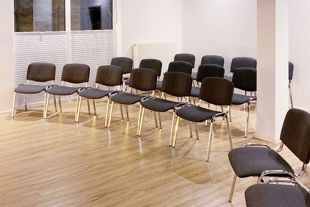 Ausgestattet mit 20 Gymnastikmatten, 20 Stühle und 6 Tische sowie ausreichend Gläser und Tassen